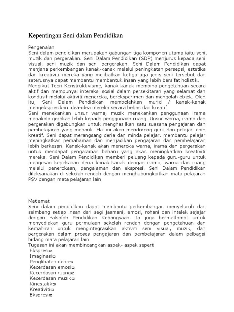 Kepentingan Seni Dalam Pendidikan Pdf : Kepentingan Seni Dalam Pendidikan Flip Ebook Pages 1 9 Anyflip. Matematik pada mulanya digunakan dalam perdagangan, pengukuran tanah, corak tenunan dan lukisan dan untuk merekodkan masa. Memperoleh berbagai kasus yang berharga yang dapat digunakan oleh tenaga pengajar sebagai contoh dalam memberikan materi perkuliahan atau proses pendidikan lainnya dan menemukan berbagai masalah untuk pengembangan penelitian.